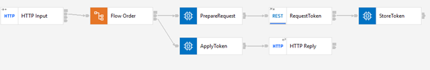The bottom branch starts from the original input message, adds the token to the Authorization header (and body for debugging purposes), and sends out the message to the API endpoint.